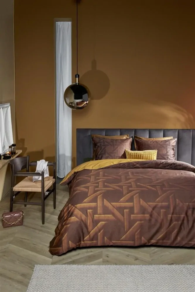 Povlečení Parsons Gold od Kardol je moderní design, který pracuje s optikou! Elegantní pravidelné vzory zjemněné zvolenými barvami, které vytváří dojem klidného a upraveného lože. Barvy krásně propojí lesk povrchu luxusního bavlněného saténu. Tento design je inspirován současným uměním, a proto se hodí do moderních ložnic. Zadní strana povlaku na deku i na polštář je sytě zlatá.
