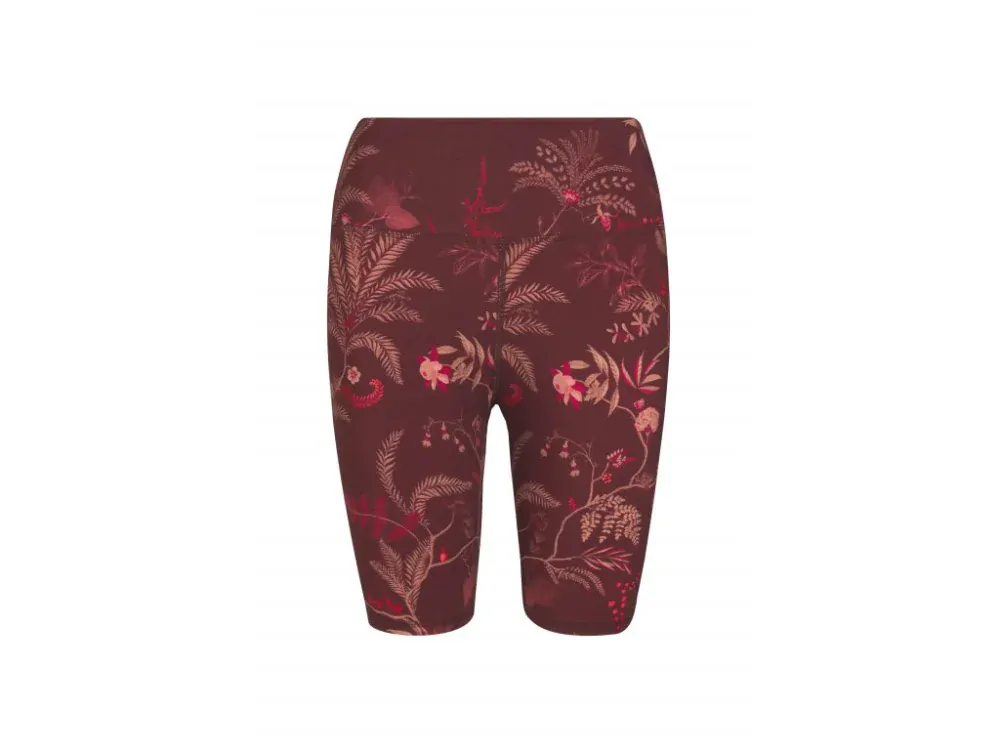 Krátké elastické sportovní kraťasy s vyšším pasem jsou díky svému složení a vysokému podílu elastanu velmi pohodlné a funkční zároveň. Tmavě růžová barva je bohatě zdobená florálním motivem v jemném kontrastu. Pas je podšitý látkou v motivu Suki.