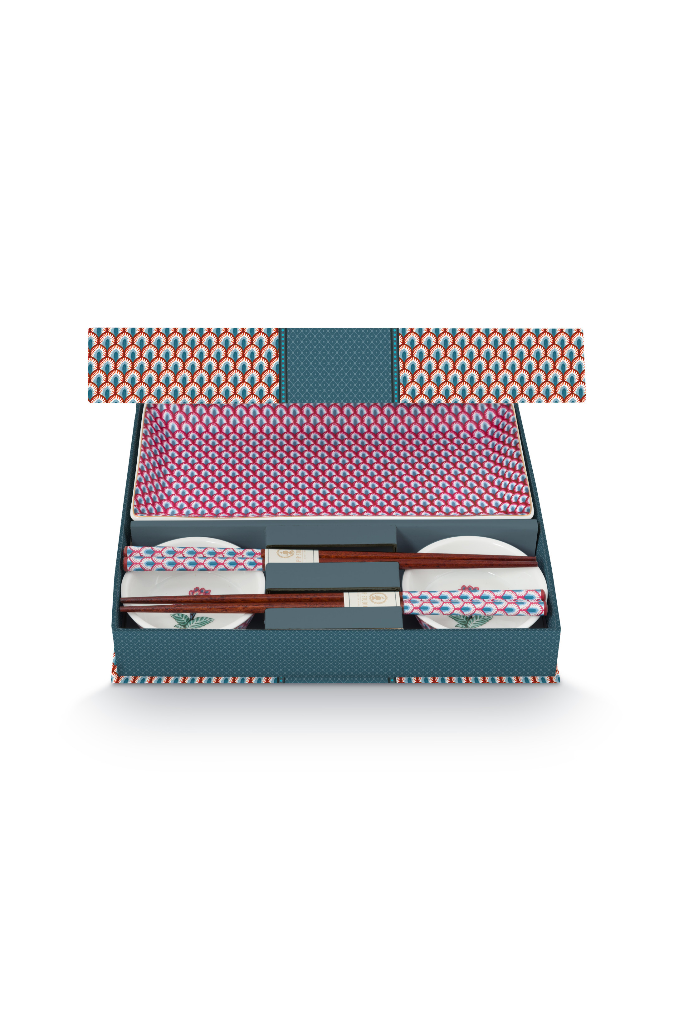Pip Studio Flower Festival Oriental sada 2 kusů talířků 23x11,5x2,2cm, 2 kusů misek Ø8cm a 2 sad hůlek, modrá