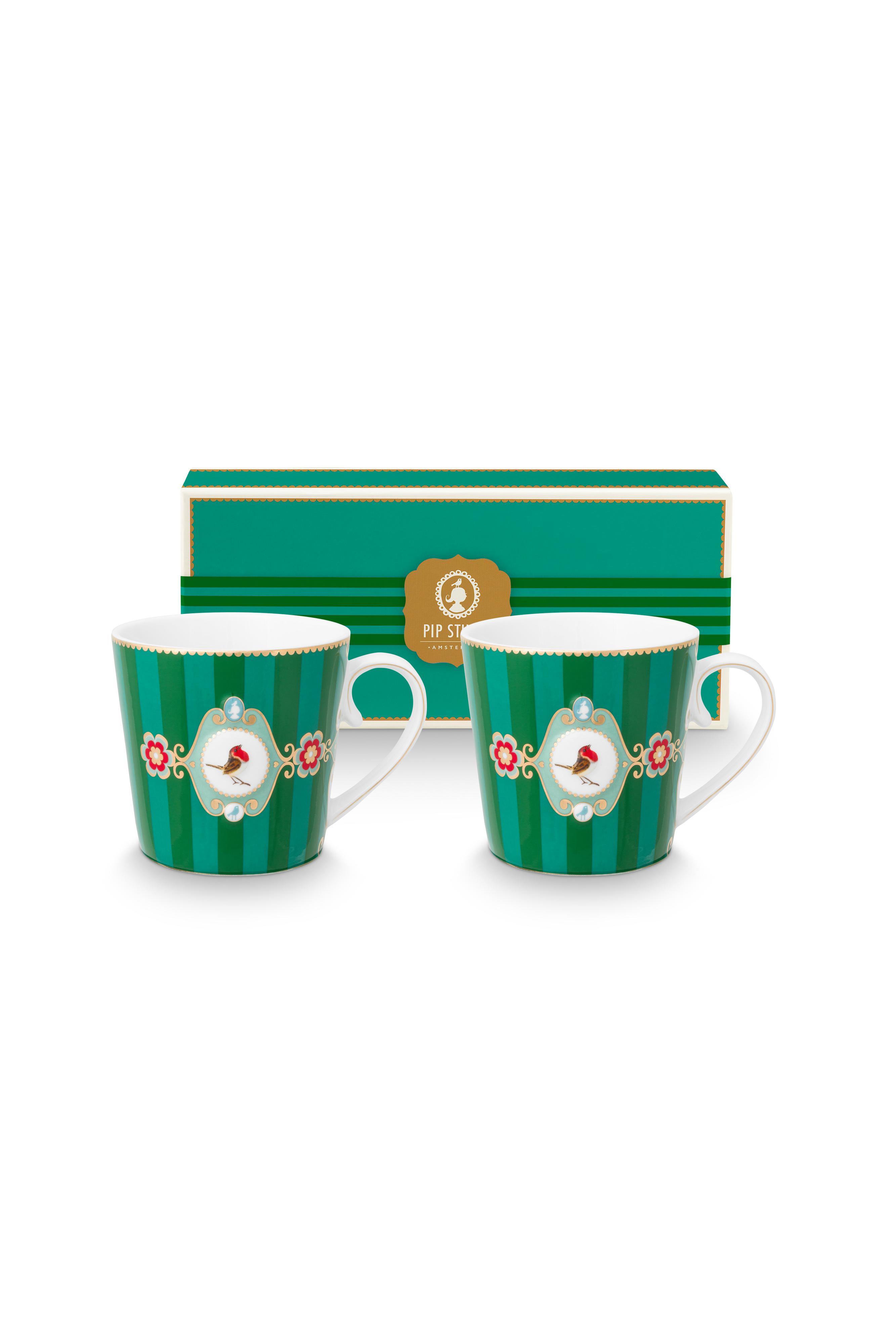 Pip Studio Love Birds Stripes sada 2 ks hrnků 225 ml, zelená