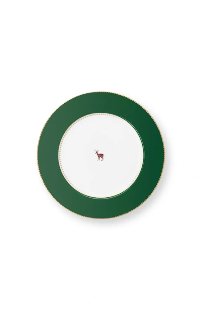 Talíř z nejoblíbenějšího designu Pip Studia Love Birds. Talířek je zdobený zeleným okrajem se zlatými detaily. Středu talířku dominuje malý, hrdý jelínek. Krásně se kombinuje s ostatními porcelánovými předměty z této kolekce.