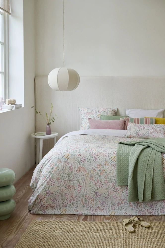Jemné, svěží a nadčasové povlečení, které vnese do ložnice klid a lehkost přírody. Bohatý květinový vzor v pastelových odstínech zelené, růžové a béžové působí elegantně a harmonicky, aniž by byl příliš výrazný. Díky oboustrannému provedení – s drobným geometrickým vzorem na rubu – snadno změníte vzhled postele podle nálady.